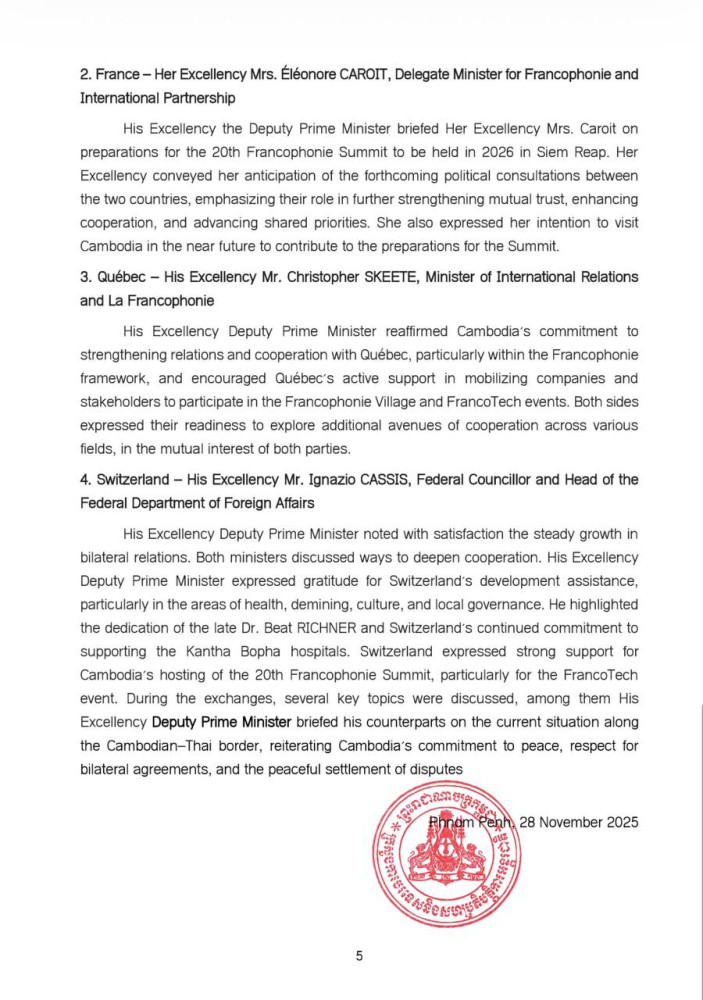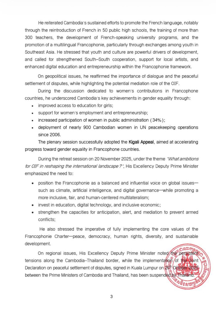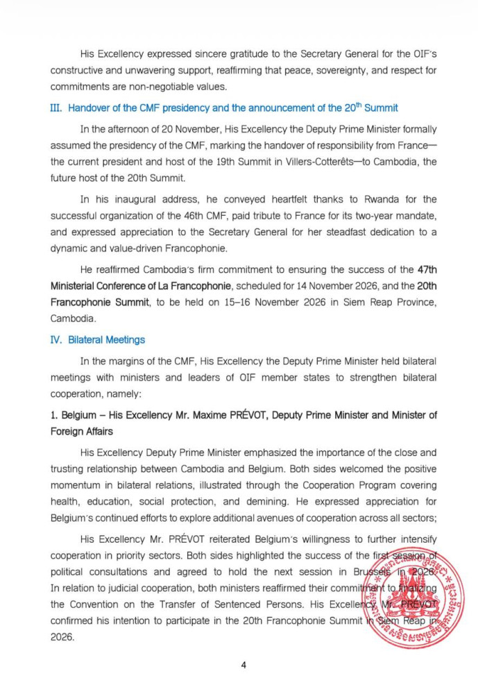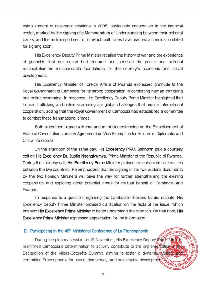 AKP Phnom Penh, November 28, 2025 -- Cambodian Ministry of Foreign Affairs and International Cooperation this afternoon made public a press release on the outcomes of H.E. Deputy Prime Minister PRAK Sokhonn's participation in the 46th Ministerial Conference of La Francophonie and Bilateral Meetings in Kigali, Republic of Rwanda.