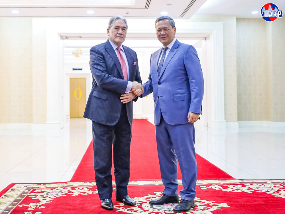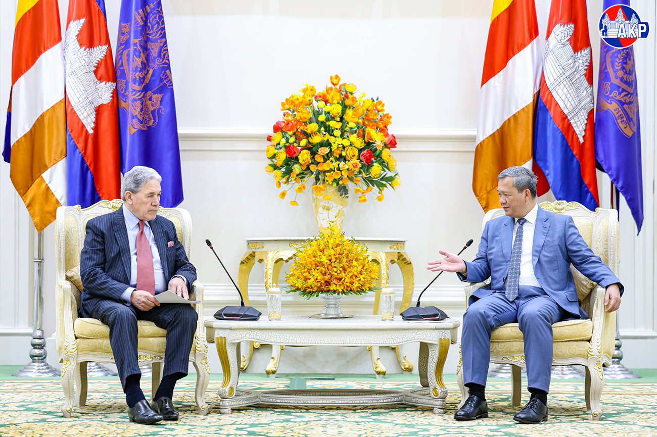 Prime Minister Samdech Moha Borvor Thipadei Hun Manet received New Zealand’s Minister of Foreign Affairs, H.E. Winston Peters, and his delegation at the Peace Palace for a courtesy call and working discussions.