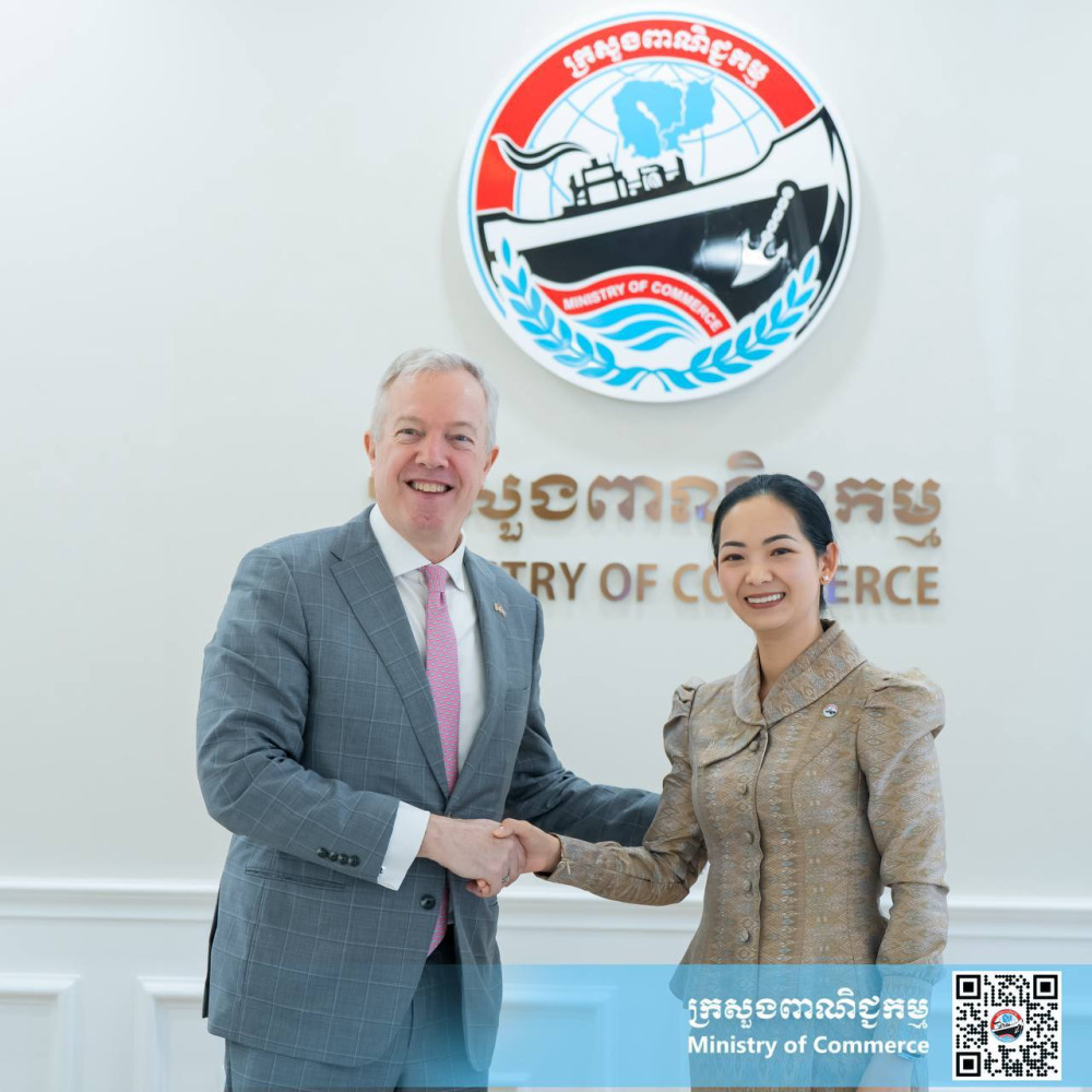 Cambodia’s Minister of Commerce H.E. Mrs. Cham Nimul (R, Pic. 1) shakes hands with Ambassador Ted Osius (ret.), Senior Vice President and Regional Managing Director of U.S.-ASEAN Business Council (USABC), prior to their meeting at the ministry’s office here this morning.