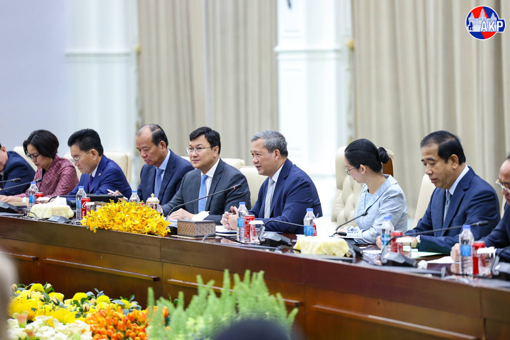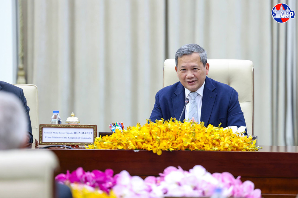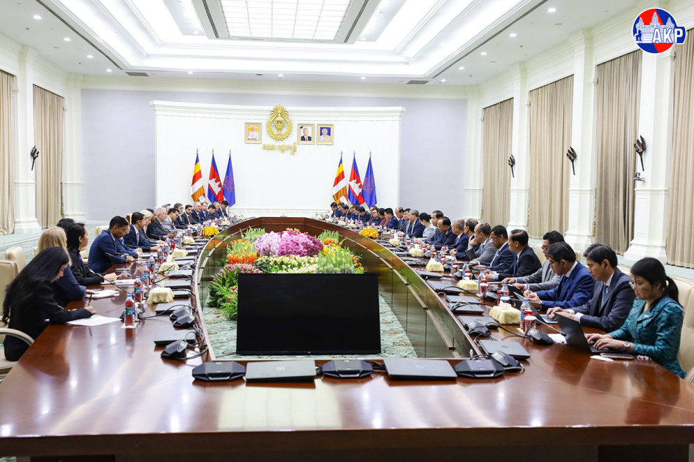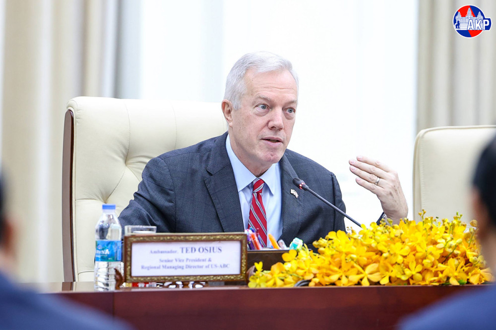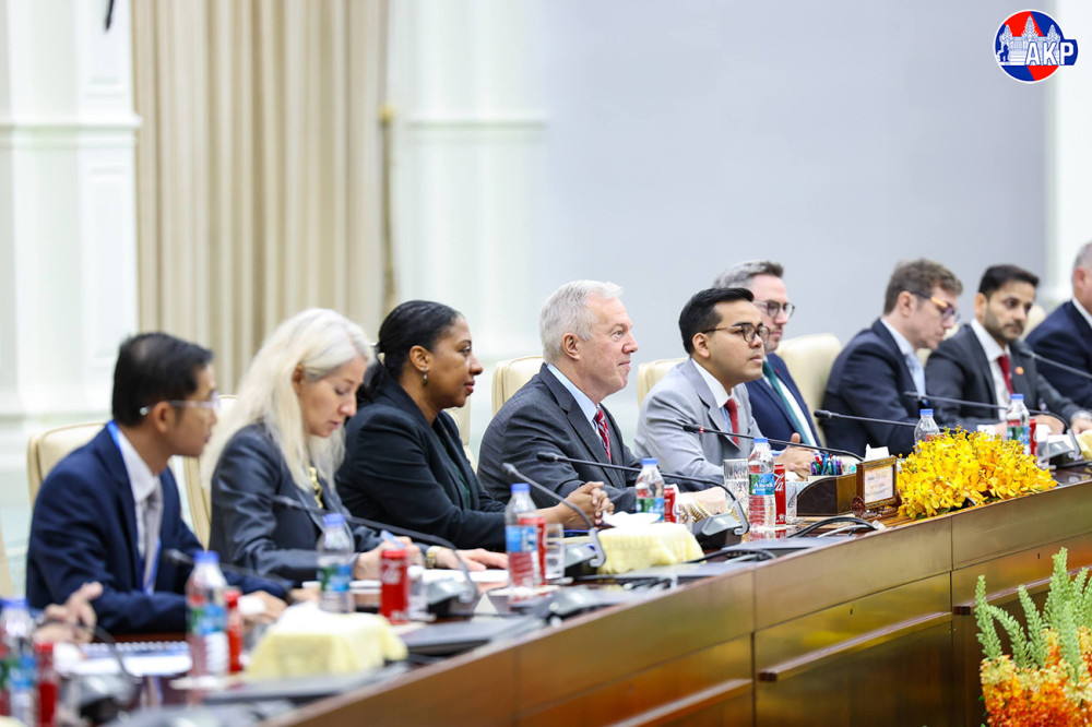 Samdech Moha Borvor Thipadei Hun Manet (L, Pic. 1), Prime Minister of the Kingdom of Cambodia, greets Mr. Ted Osius, Senior Vice President and Regional Managing Director of the U.S.-ASEAN Business Council (U.S.-ABC), accompanied by Ms. Bridgette L. Walker (R, Pic. 1), Chargé d’Affaires a.i. of the U.S. Embassy in Cambodia, prior to their meeting at the Peace Palace in Phnom Penh this morning.