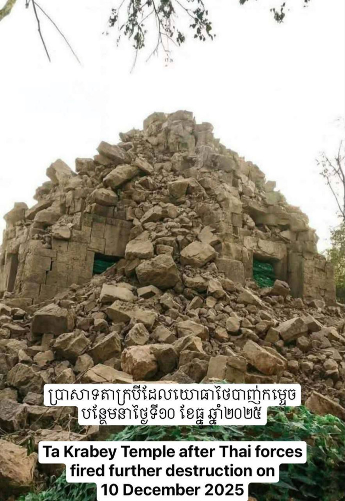 After suffering heavy destruction from Thai military attacks on Dec. 9, 2025, Ta Krabey Temple, a sacred site of Cambodia, has once again come under renewed shelling on Dec. 10, resulting in the complete devastation of its appearance and architectural structure, although the Ministry of Culture and Fine Arts has already made its appeal.