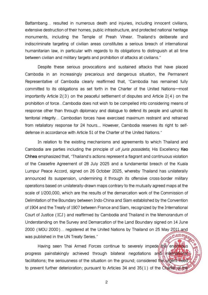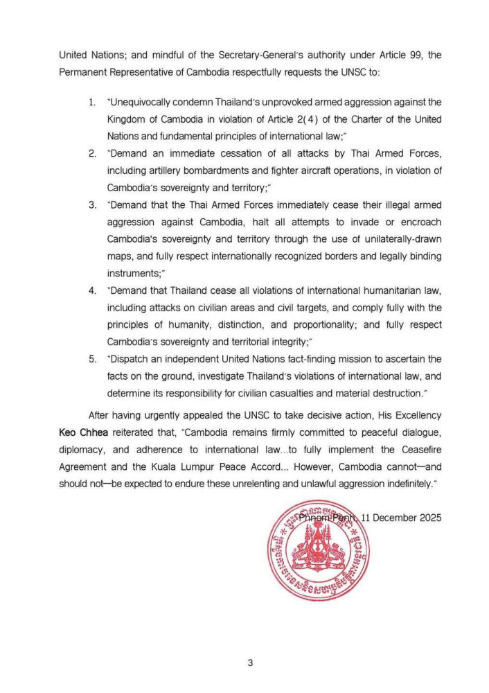 H.E. Keo Chhea, Permanent Representative of the Kingdom of Cambodia to the United Nations in New York has requested the United Nations Security Council to “demand that the Thai armed forces immediately cease their illegal armed aggression against the Kingdom of Cambodia.”