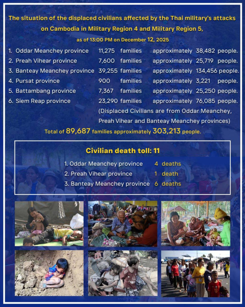 The number of Cambodian civilians displaced by continued Thai military attacks on Cambodian territory has jumped to 303,213 people, representing more than 89,687 families, as of 1:00 p.m. on Dec. 12.