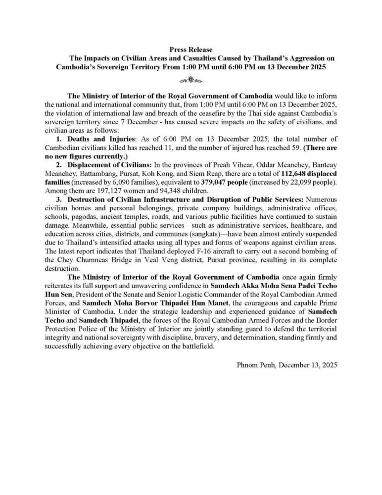 AKP Phnom Penh, December 13, 2025 -- The Ministry of Interior this evening issued a press release regarding the impact on civilian areas and casualties caused by Thailand’s military attacks on Cambodia’s sovereign territory from 1:00 p.m. until 6:00 p.m on Dec. 13.