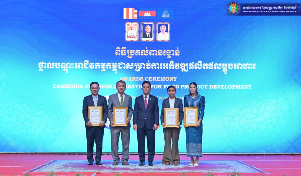 The ceremony also featured the awards presentation for the Cambodian Business Incubation for Food Product Development (CBI-Food) programme, a key project activity promoting innovation in food processing using local raw materials. Following a nationwide competition involving 30 student teams, eight finalist teams presented their products, with three teams receiving first, second, and third place awards.