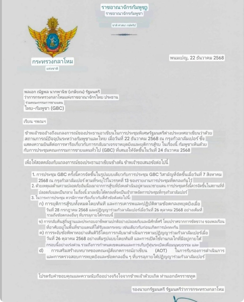Thai media reports have interpreted the letter – addressed to H.E. Gen. (Ret.) Nattaphon Narkphanit, Minister of Defence of Thailand and Co-Chairman of the Thailand-Cambodia General Border Committee (GBC) – as Cambodia’s formal proposal for a ceasefire.