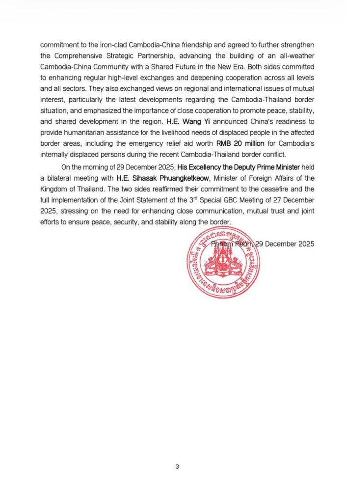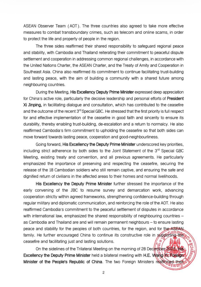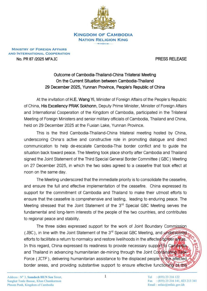 Outcome of Cambodia-Thailand-China Trilateral Meeting on Current Situation between Cambodia-Thailand