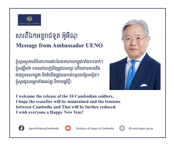 “I hope the ceasefire will be maintained and the tensions between Cambodia and Thai will be further reduced,” said H.E. Ueno Atsushi, Ambassador of Japan to Cambodia. “I wish everyone a Happy New Year!”