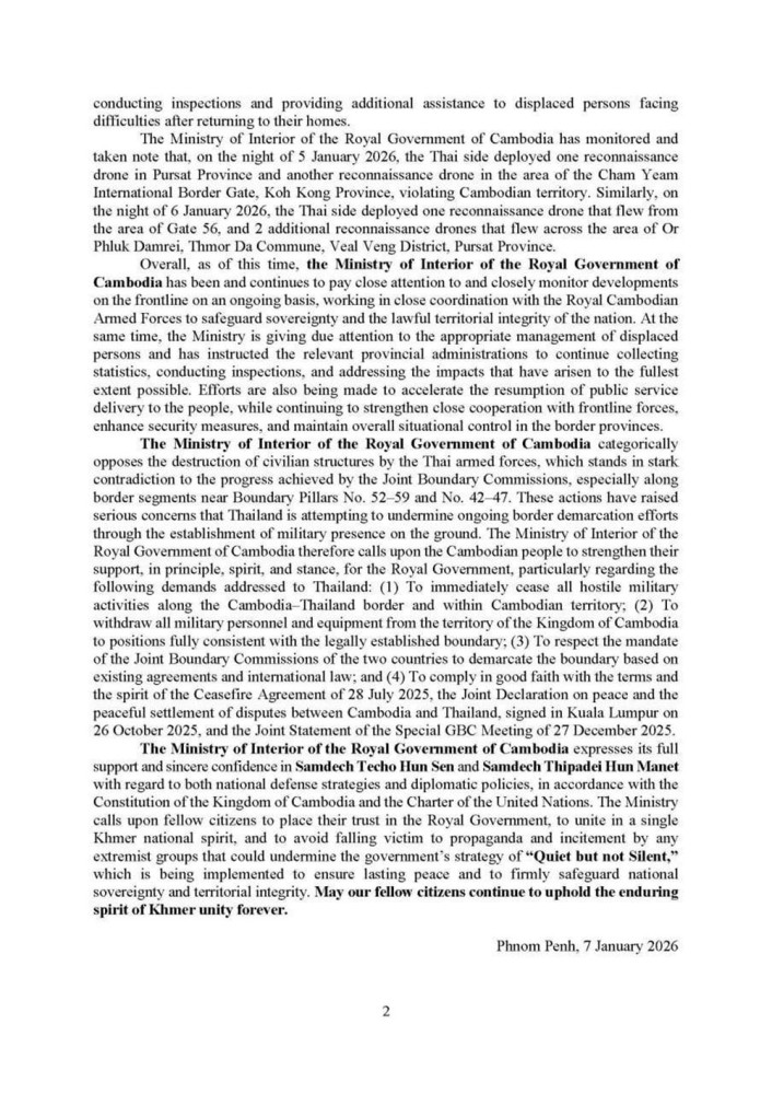 The Ministry of Interior of Cambodia has reported incursions by Thai reconnaissance drones into Cambodian sovereign territory on Jan. 5 and 6, 2026.