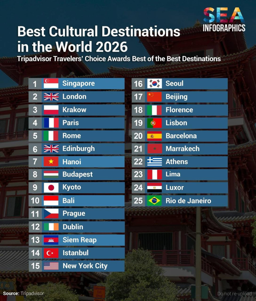 Siem Reap sits 13th among the 25 Best Cultural Destinations. Singapore topped the list, followed by London, Krakow, and Paris.