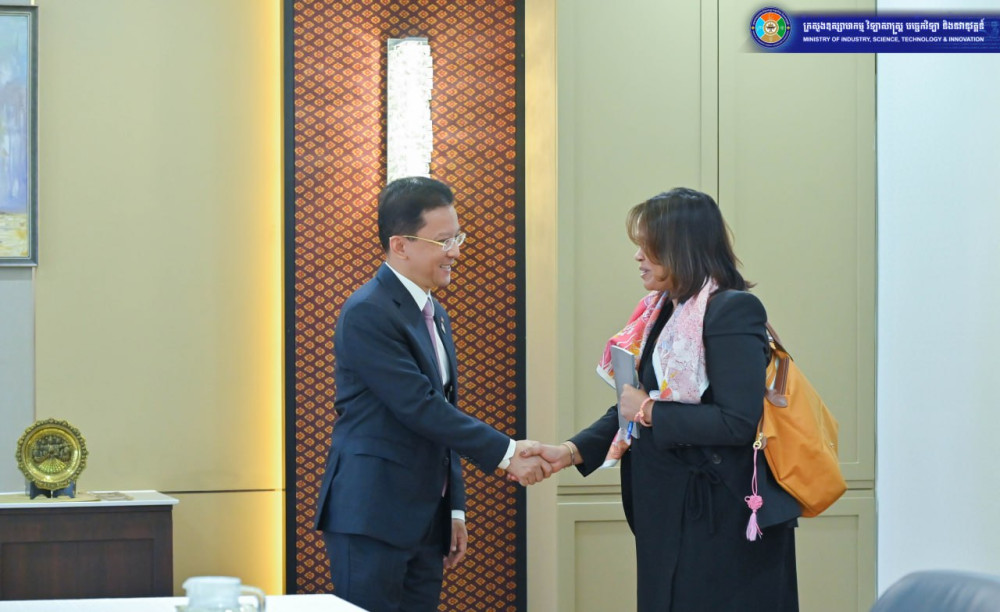 Minister of Industry, Science, Technology & Innovation H.E. Hem Vanndy has met with a delegation from the International Finance Corporation (IFC), led by Ms. Towfiqua Hoque, IFC Resident Representative to Cambodia, to discuss the transformation of Cambodia’s Garment, Footwear and Travel Goods (GFT) sector, with a strong focus on productivity, backward linkages, and the integration of local MSMEs into global supply chains.
