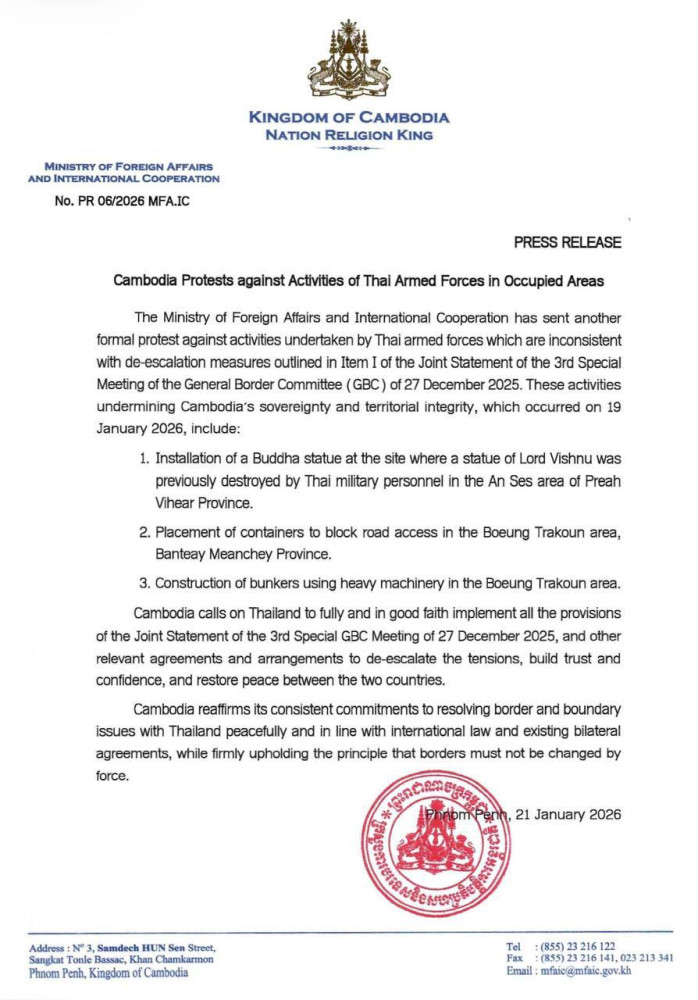 Cambodia Protests against Activities of Thai Armed Forces in Occupied Areas