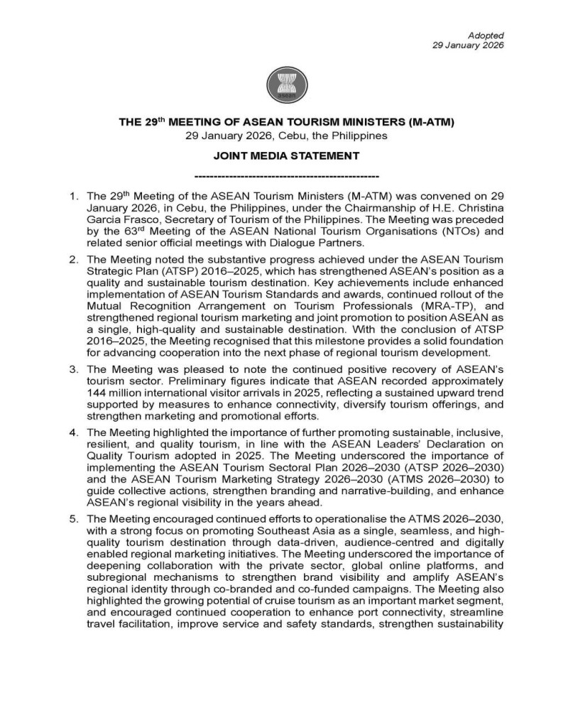 The following is the Joint Media Statement of the 29th Meeting of ASEAN Tourism Ministers (M-ATM) in Cebu, Philippines, released this evening by the Ministry of Tourism: