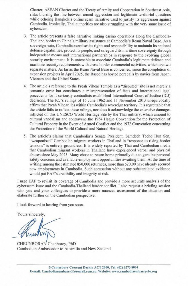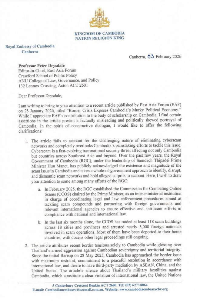 H.E. Dr. CHEUNBORAN Chanborey, Cambodian Ambassador to Australia and New Zealand, has sent a letter to the Editor-in-Chief of East Asia Forum (EAF), rebutting the article published by EAF on Jan. 28, 2026, titled “Border Crisis Exposes Cambodia’s Murky Political Economy”.