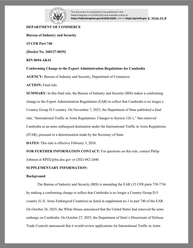 The United States has officially removed Cambodia from its list of arms-embargoed countries under the Export Administration Regulations (EAR), following a final rule issued by the U.S. Department of Commerce’s Bureau of Industry and Security (BIS).