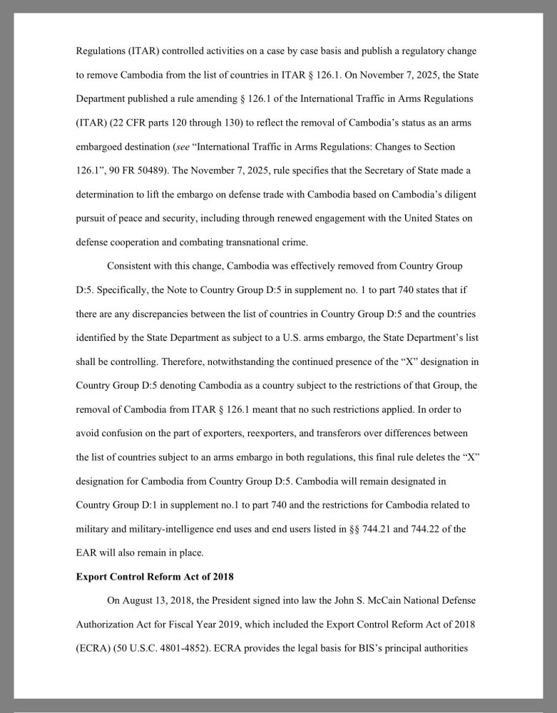 According to BIS, the change aligns the EAR with amendments made to the International Traffic in Arms Regulations (ITAR) on Nov. 7, 2025, when the State Department formally removed Cambodia from Section 126.1 of the ITAR. The State Department said the decision was based on Cambodia’s “diligent pursuit of peace and security,” including renewed engagement with the United States on defence cooperation and efforts to combat transnational crime.