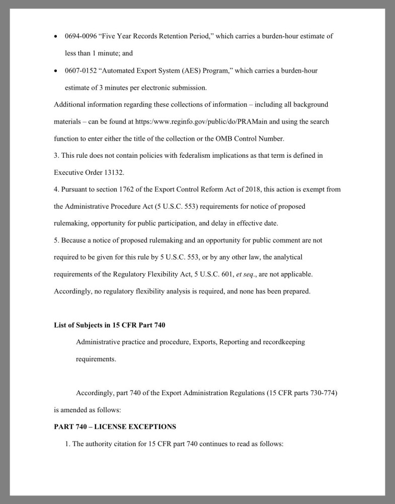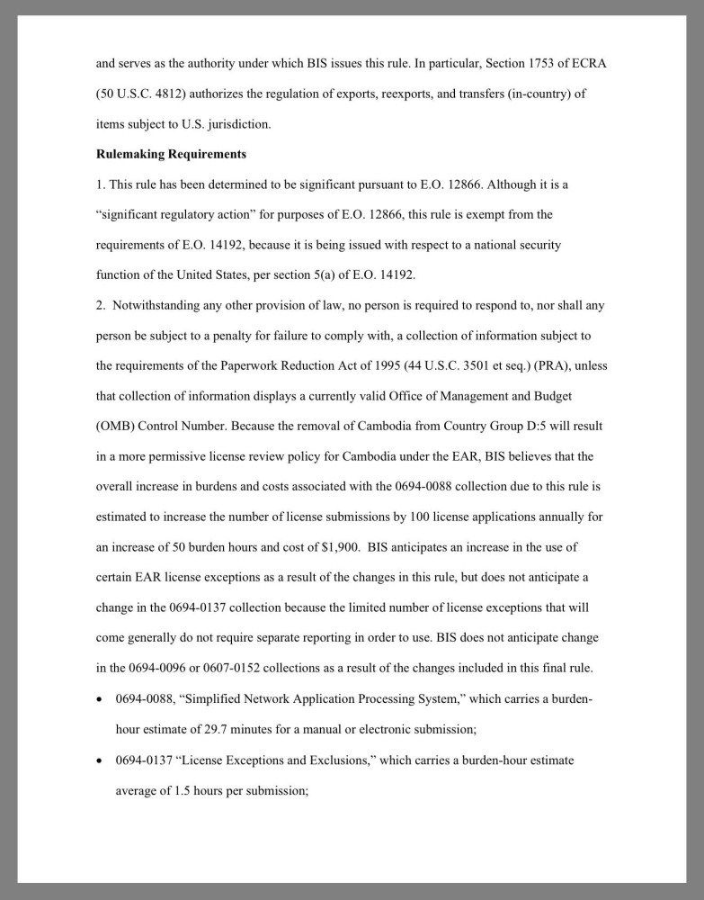 BIS noted that the regulatory change is expected to result in a more permissive license review policy for Cambodia and may lead to a modest increase in export licence applications. However, the rule does not alter existing national security safeguards and was issued under the authority of the Export Control Reform Act of 2018.