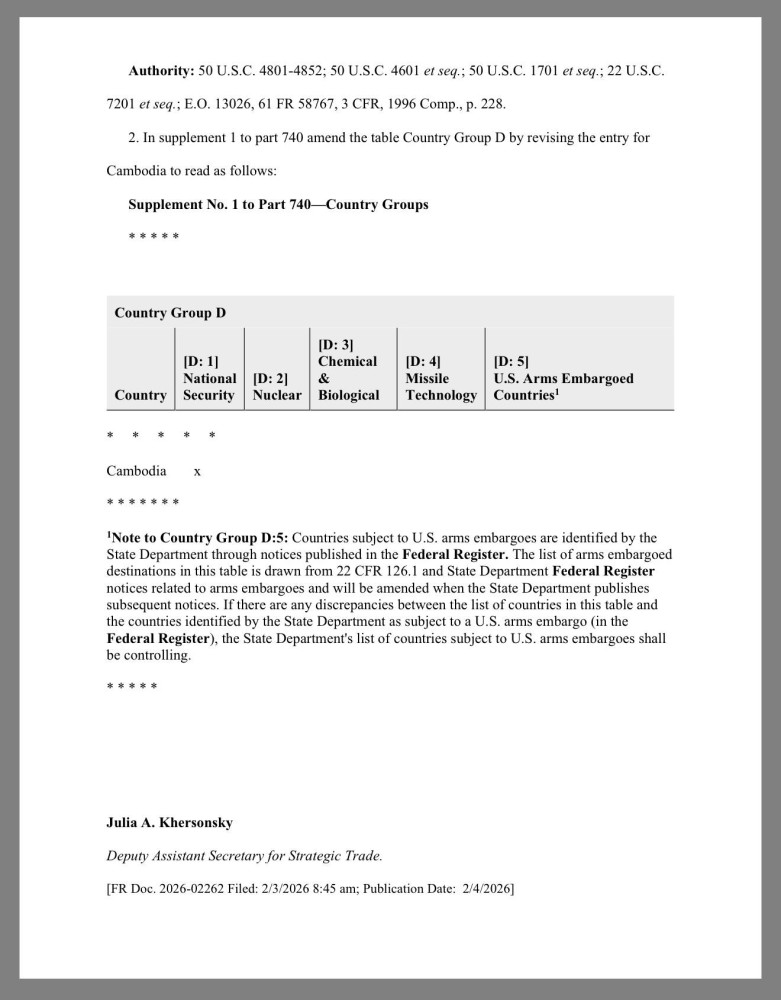 The rule, which took effect on Feb. 3, reflects an earlier decision by the U.S. Department of State to lift its arms embargo on Cambodia. As a result, Cambodia is no longer designated under Country Group D:5, which applies to countries subject to U.S. arms embargoes.