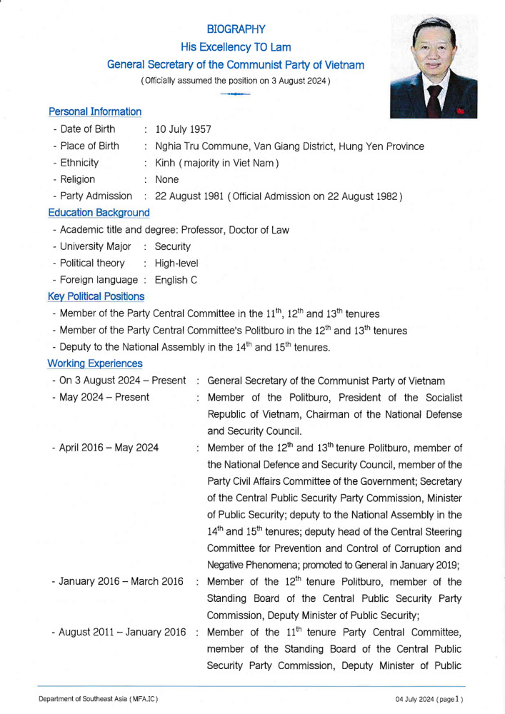 Biography of General Secretary of Communist Party of Vietnam H.E. To Lam