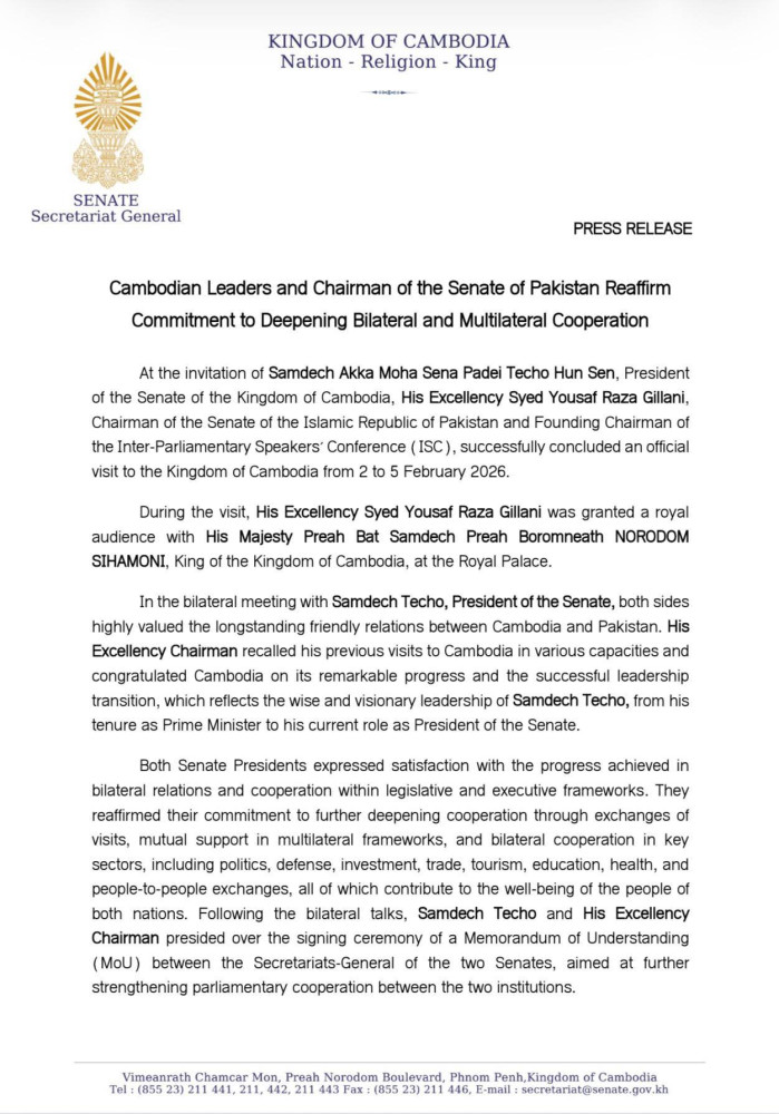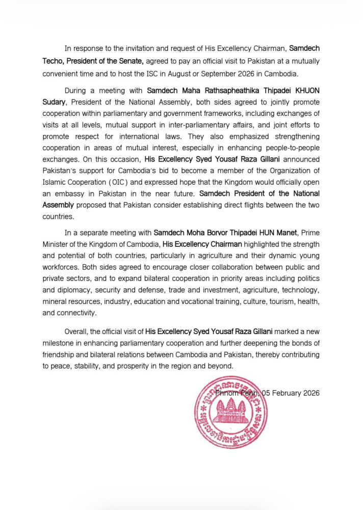 Outcomes of Official Visit of Pakistani Senate Chairman to Cambodia