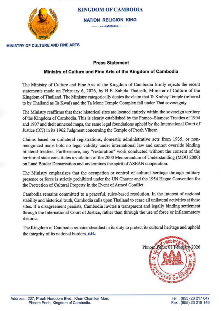 In a press statement issued on Sunday, the Ministry of Culture and Fine Arts of the Kingdom of Cambodia dismissed remarks made on Feb. 6 by Thailand’s Minister of Culture, Sabida Thaiseth, describing the claims as legally unfounded and contrary to international law.