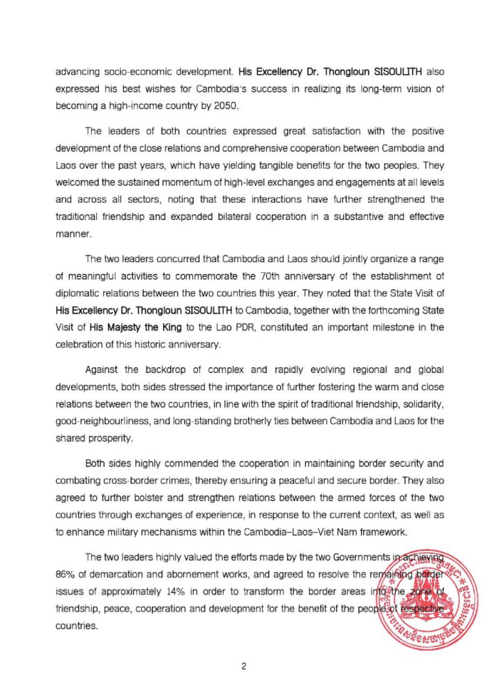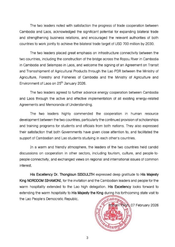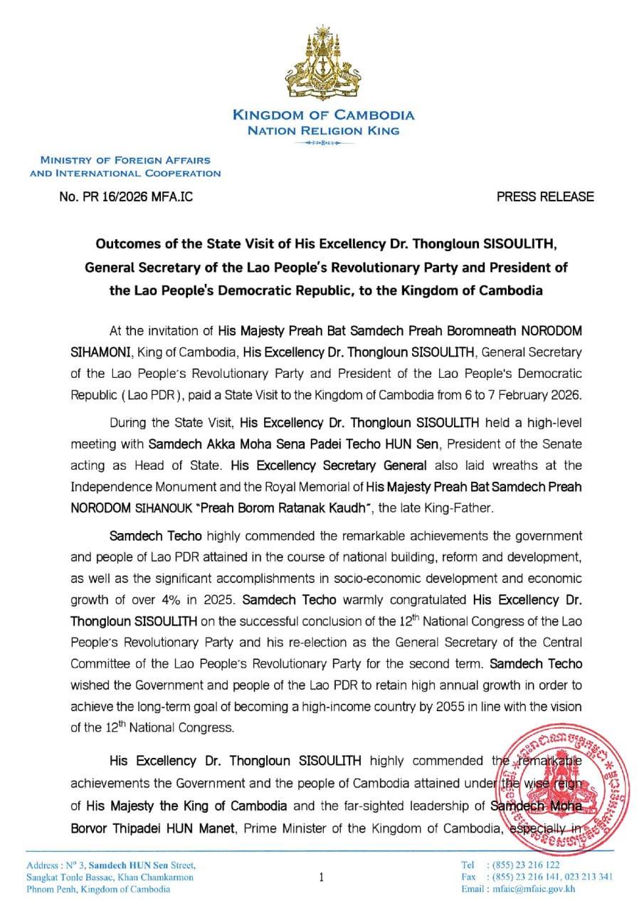 The following are the outcomes of the State Visit of H.E. Dr. Thongloun SISOULITH, General Secretary of the Lao People's Revolutionary Party and President of the Lao People's Democratic Republic, to the Kingdom of Cambodia on Feb. 6-7: