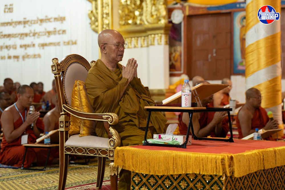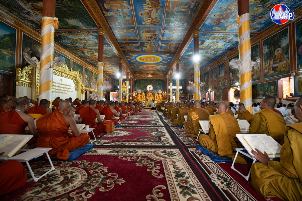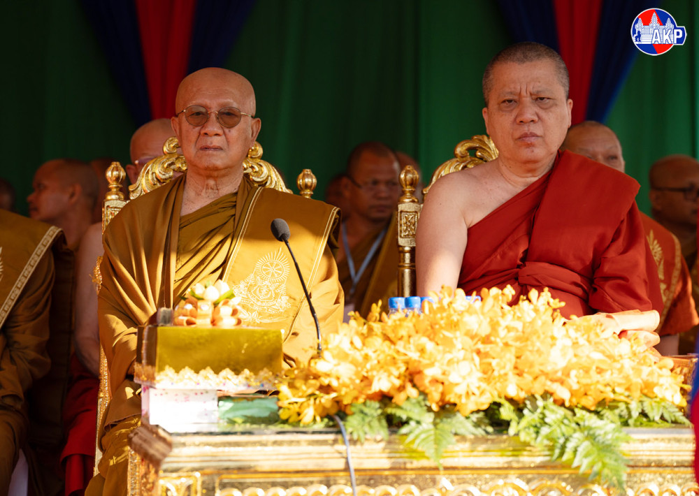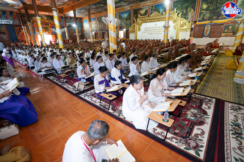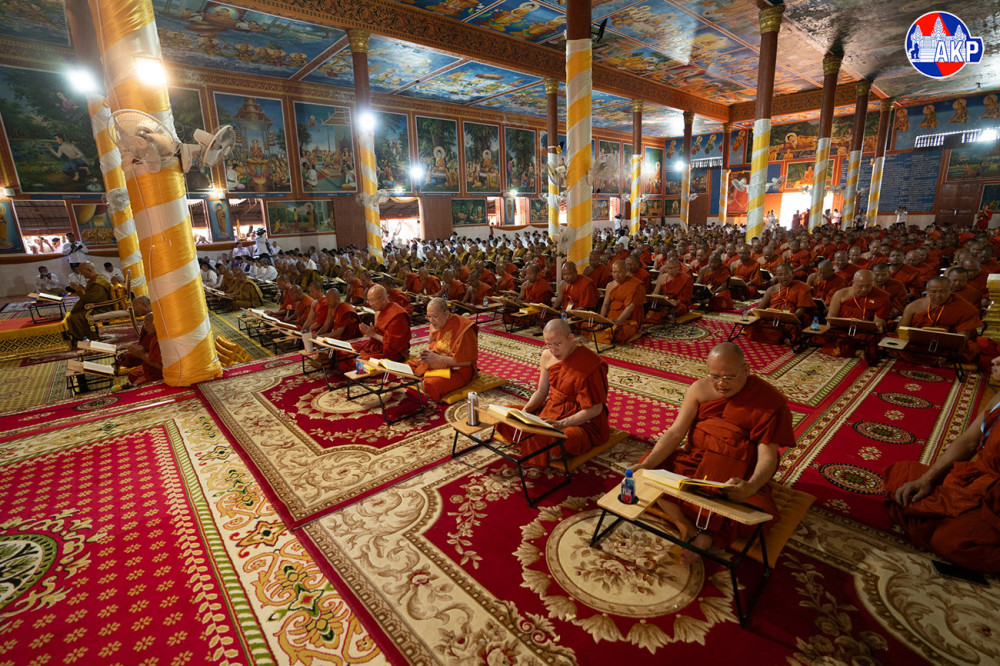H.E. Chay Borin (C, Pic. 1), Minister of Cult and Religion, presides over the celebration of the 56th anniversary of the Khmer translation of the Tipitaka, including the recital of the Tipitaka, at the Vipassana Dhura Buddhist Centre of the Kingdom of Cambodia (Phnom Preah Reach Troap) in Ponhea Leu district, Kandal province, this morning.