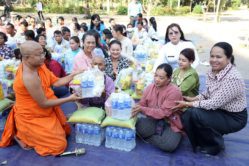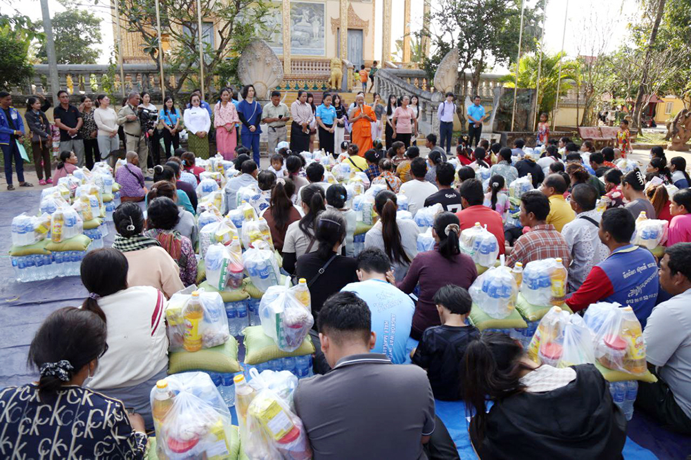 The provisions, donated by students from Irawa Gakuin High School in Japan, were handed over to Venerable Vicheth Vongsa Hem Kim San, Advisor to the Buddhist Association of Cambodia and Chief Monk of Prasat Kok Chork Pagoda. He subsequently distributed the items to families taking shelter in private homes and at the Kok Chork pagoda safety centre.