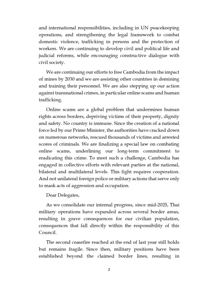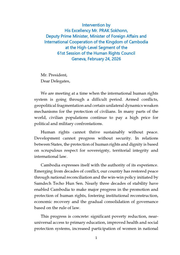 The following is the full Intervention by H.E. PRAK Sokhonn, Deputy Prime Minister, Minister of Foreign Affairs and International Cooperation of the Kingdom of Cambodia, at the High-Level Segment of the 61st Session of the Human Rights Council in Geneva on Feb. 24, 2026: