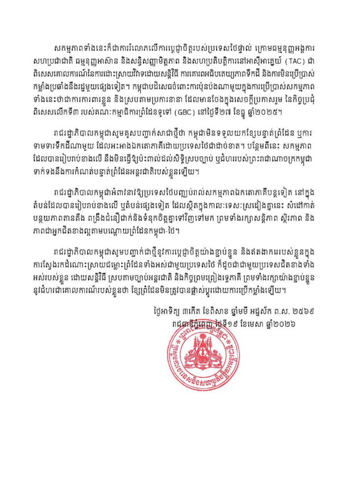 The Royal Government of Cambodia reaffirmed that it does not recognise any boundary line or territorial claim unilaterally asserted by Thailand, and said the reported activities would not affect Cambodia’s legal rights or position regarding its international boundary.