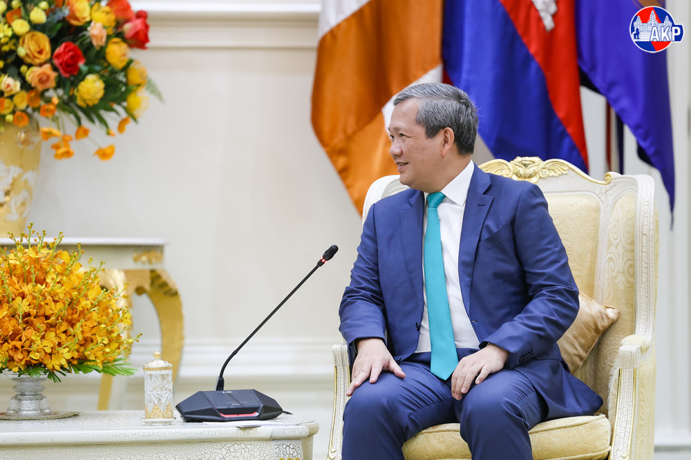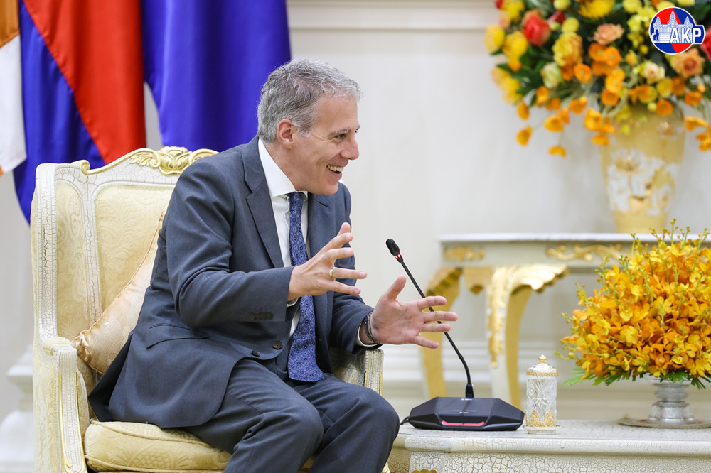 Cambodia’s Prime Minister Samdech Moha Borvor Thipadei Hun Manet (R, Pic. 1) poses for a photo with H.E. Christian DesRoches, Ambassador Extraordinary and Plenipotentiary of Canada to the Kingdom of Cambodia, prior to their meeting at the Peace Palace, Phnom Penh, this morning.