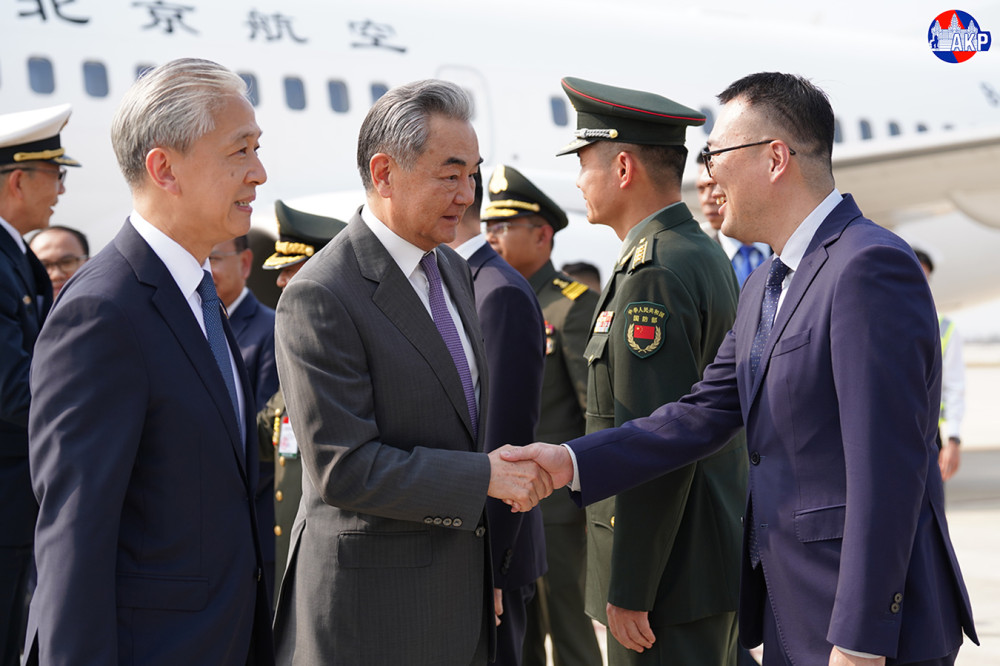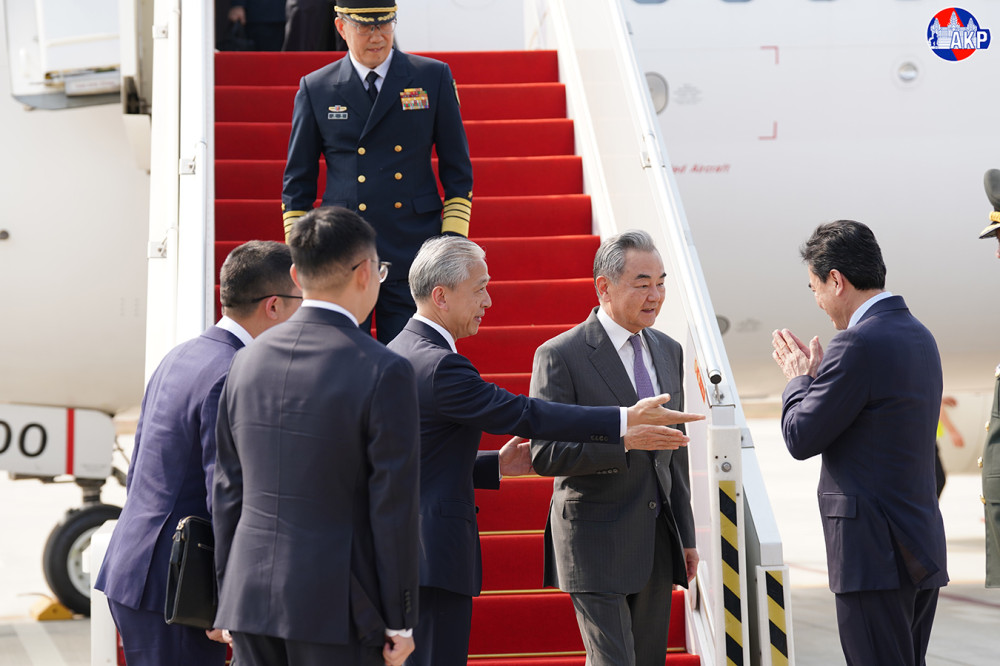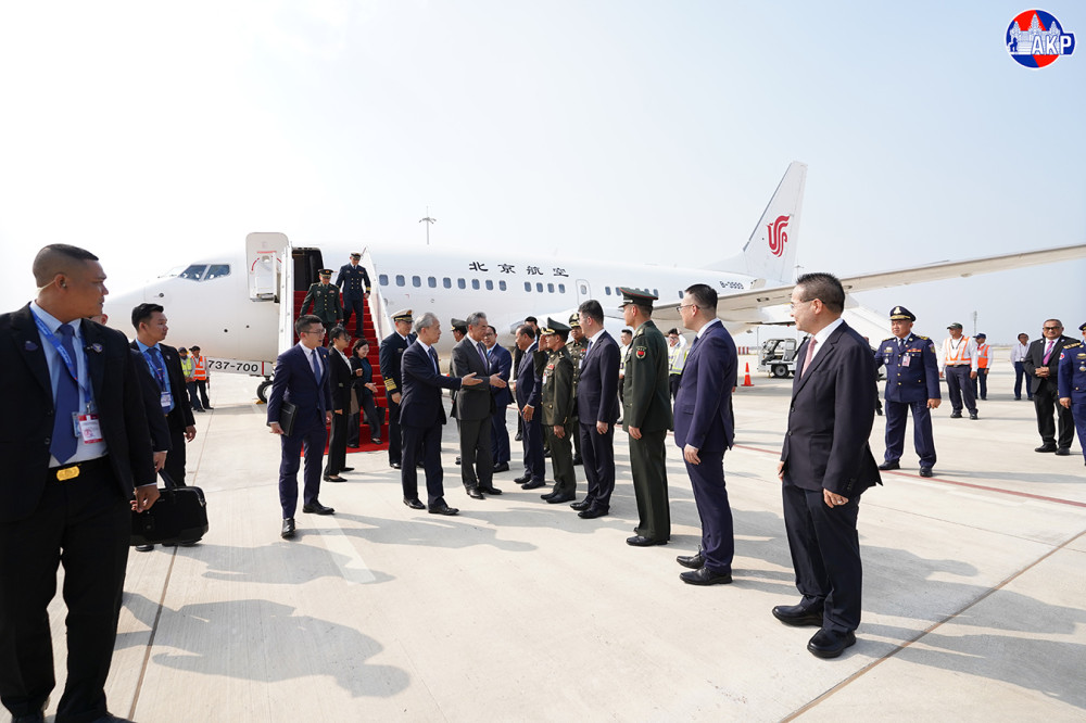H.E. Wang Yi (Front, Pic. 1), Minister of Foreign Affairs, and H.E. Dong Jun, Minister of National Defence of the People's Republic of China, disembark from an aircraft upon their arrival at the Techo International Airport this afternoon to co-chair the First Meeting of the "2+2" Strategic Dialogue Mechanism with their Cambodian counterparts.